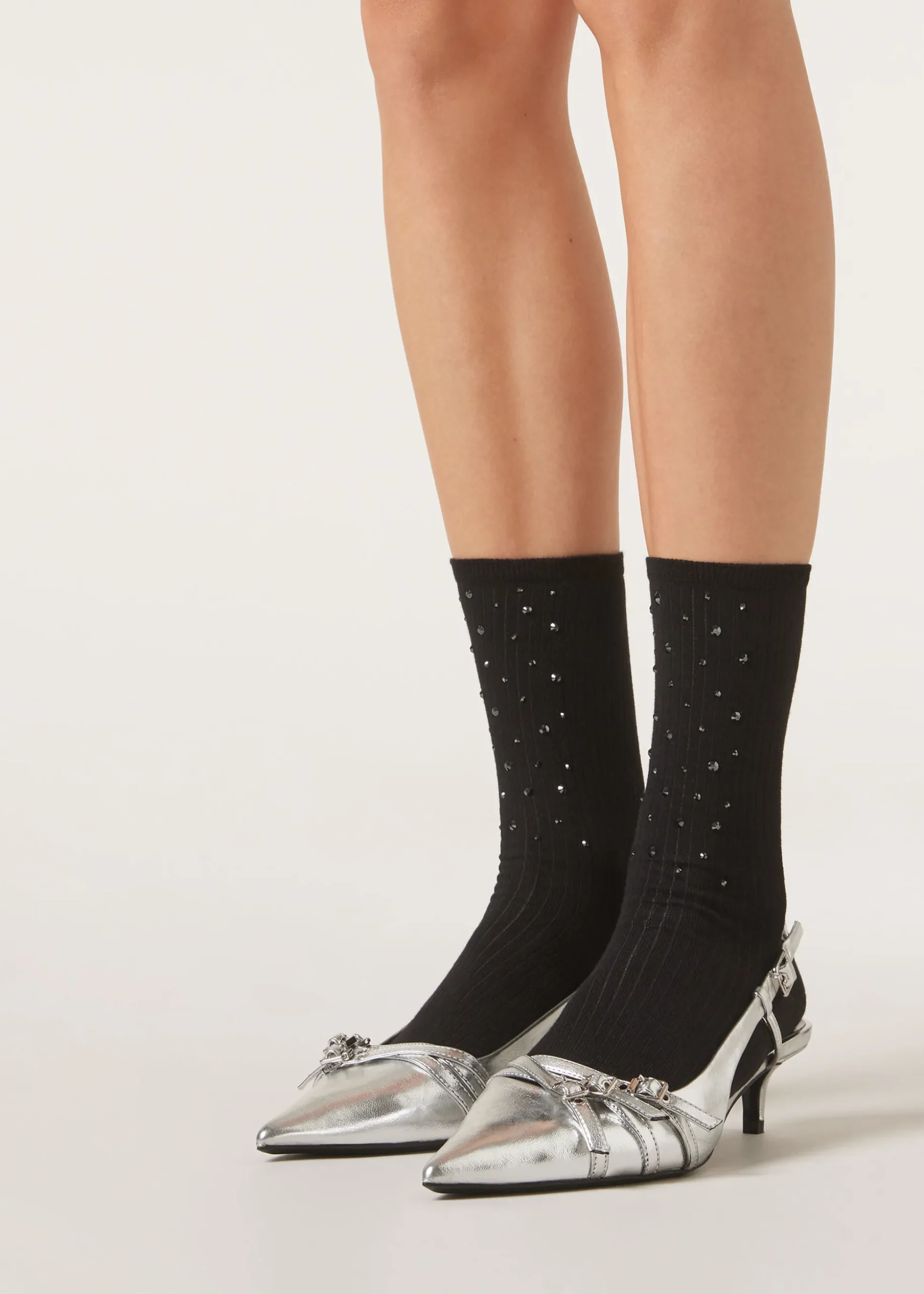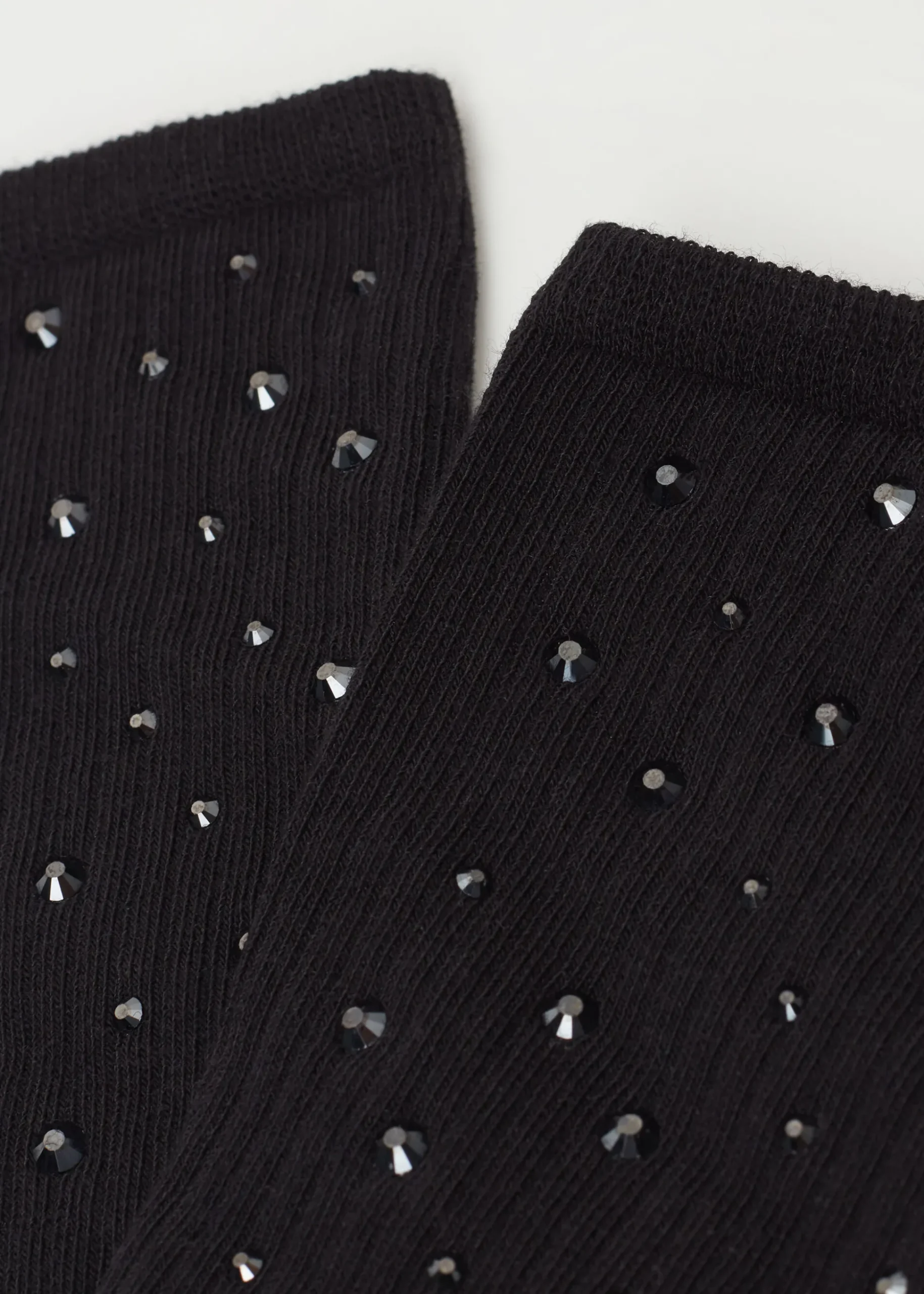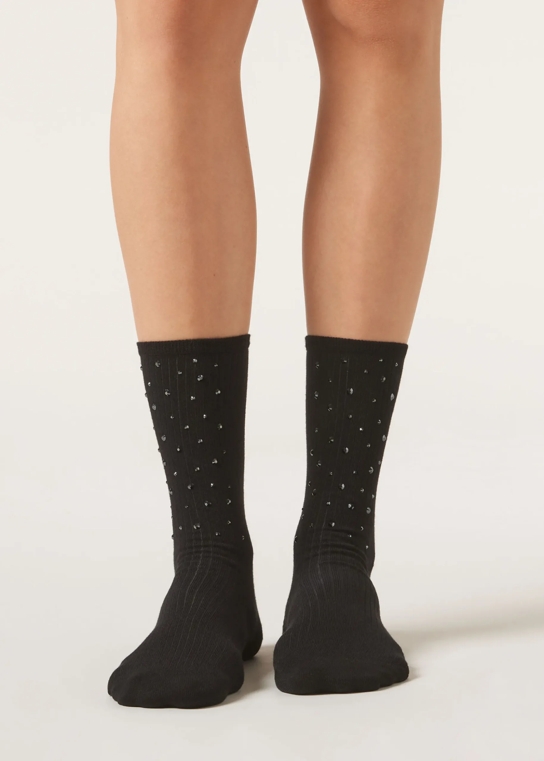 Calze corte da donna realizzate in cotone lavorato a coste, caratterizzate da un’elegante applicazione di strass sulla parte anteriore. Questo dettaglio aggiunge un tocco di brillantezza e stile al tuo look, rendendole perfette per occasioni speciali e per chi cerca un accessorio esclusivo.
