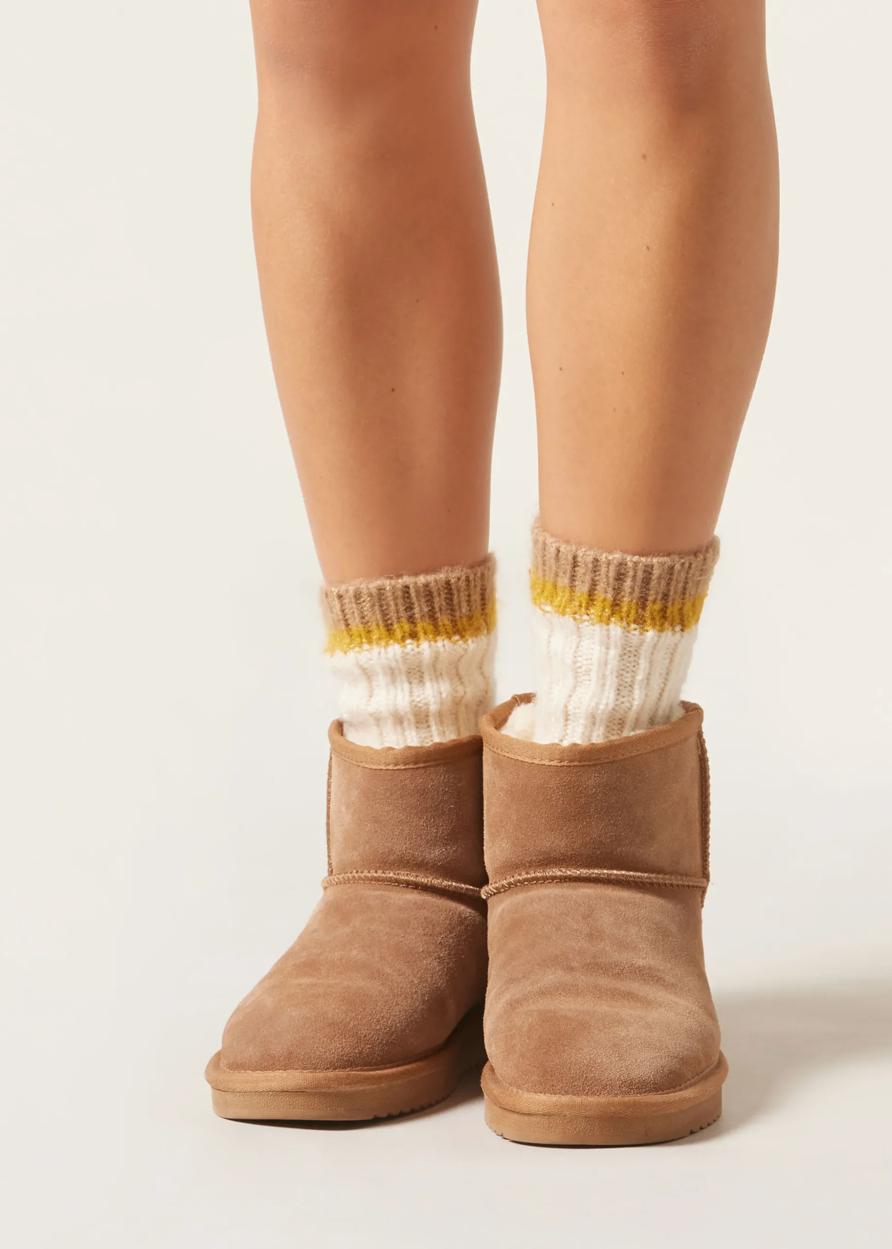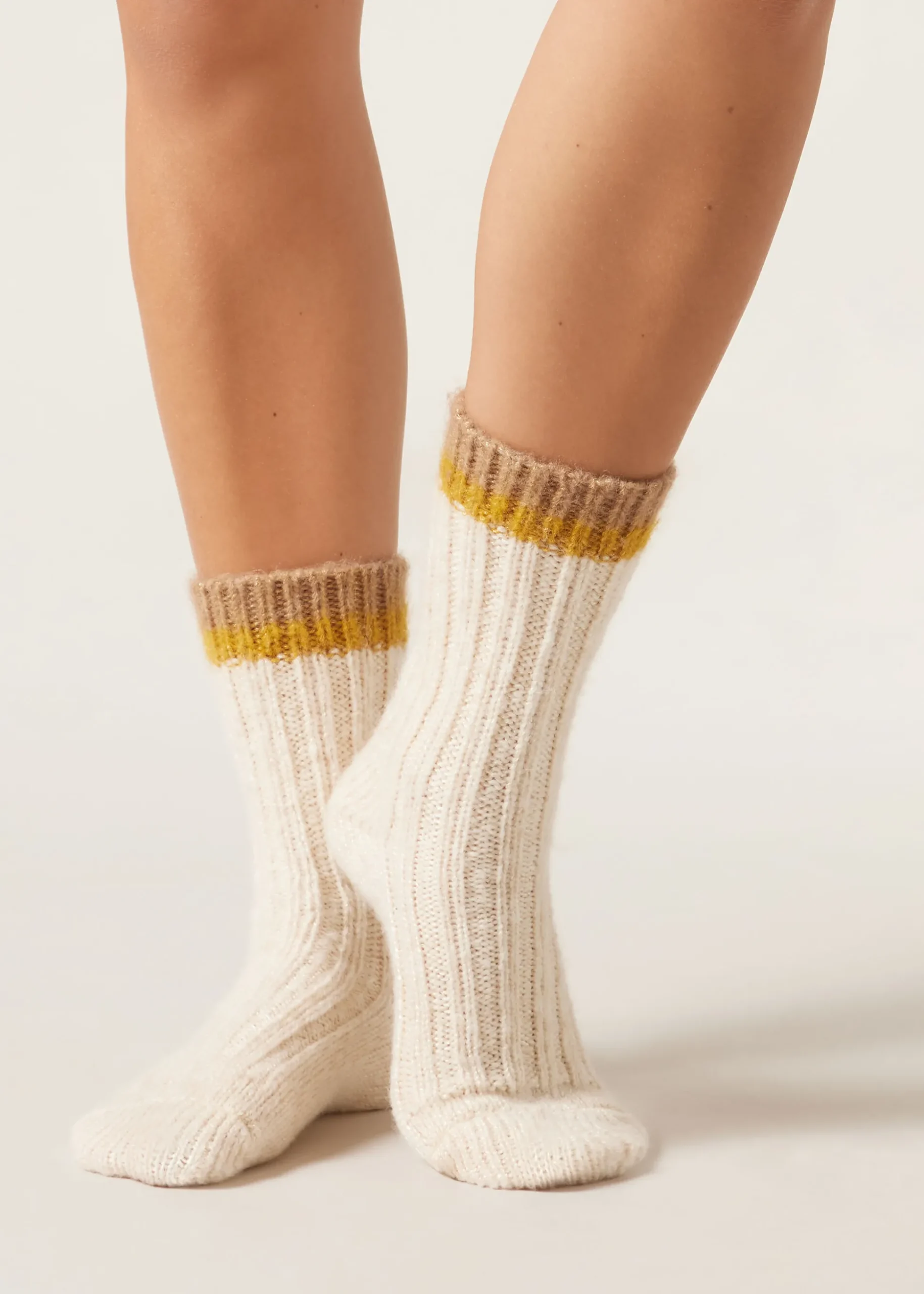 Calze corte da donna realizzate con lana calda e pesante, caratterizzate da una lavorazione a coste con bande sul bordo. Ideali per i mesi freddi, offrono comfort ottimale e stile distintivo.