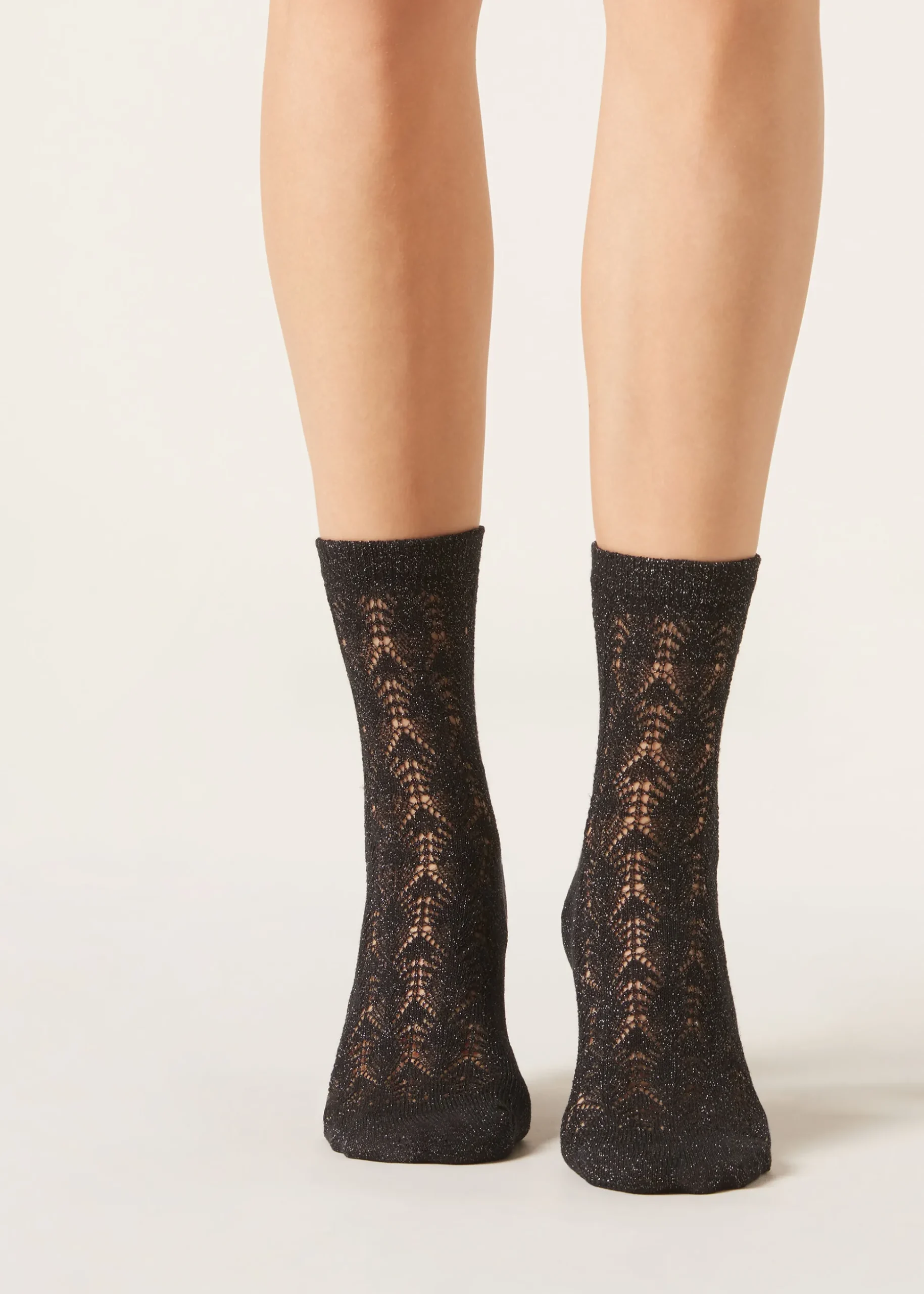 Calze corte da donna realizzate in cotone e glitter con lavorazione a traforo. Questo design offre un tocco di glamour e originalità al tuo outfit, perfetto per aggiungere un tocco di brillantezza alle tue giornate.