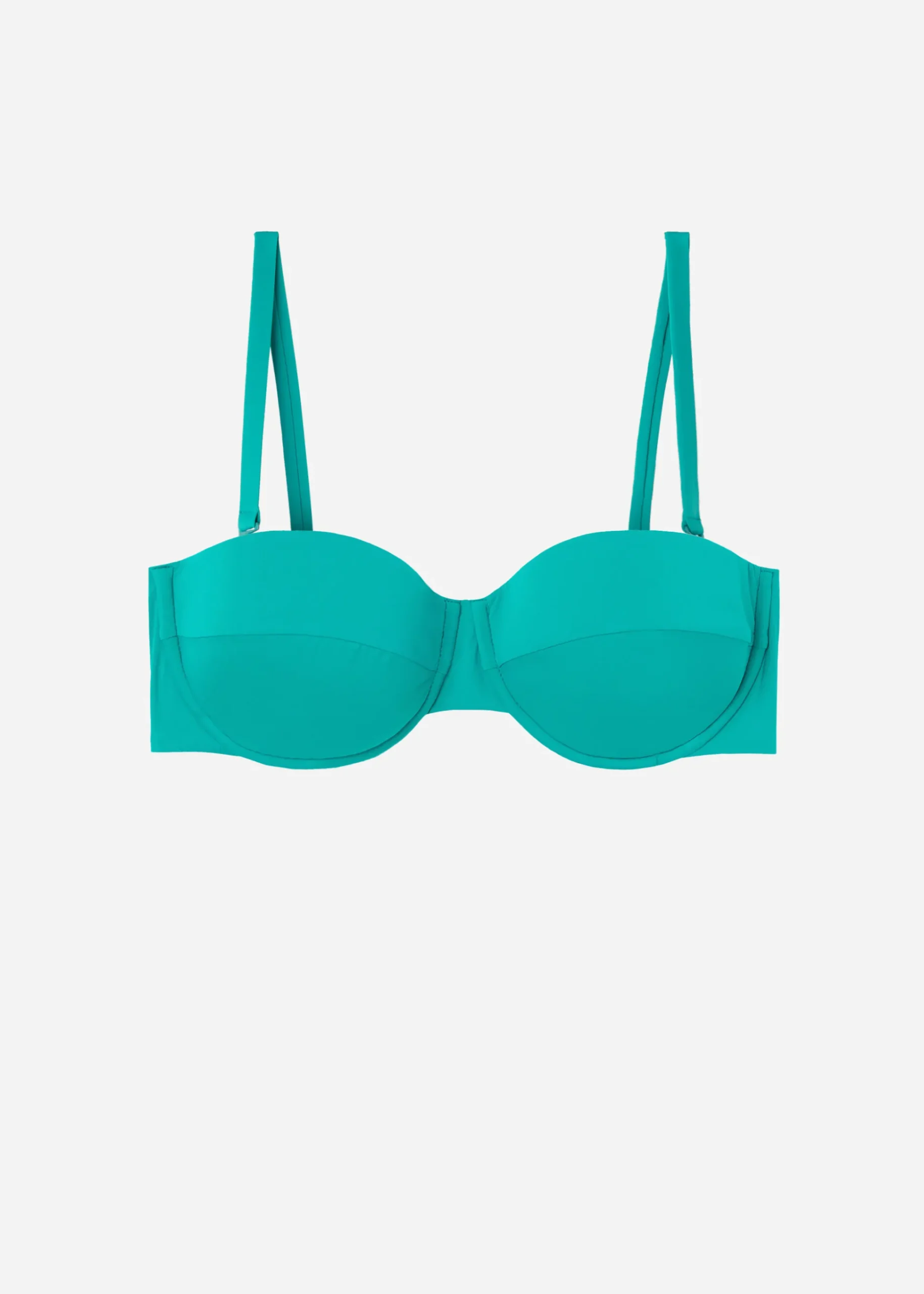 Top per bikini modello a fascia con coppe leggermente imbottite e ferretto per valorizzare il décolleté. Il taglio sulle coppe conferisce carattere al modello. Il tessuto estremamente morbido lo rende piacevole da indossare offrendo una sensazione di leggerezza e comfort sulla pelle. Spalline removibili. Chiusura posteriore con gancio e doppia regolazione per migliorare la vestibilità del girotorace.