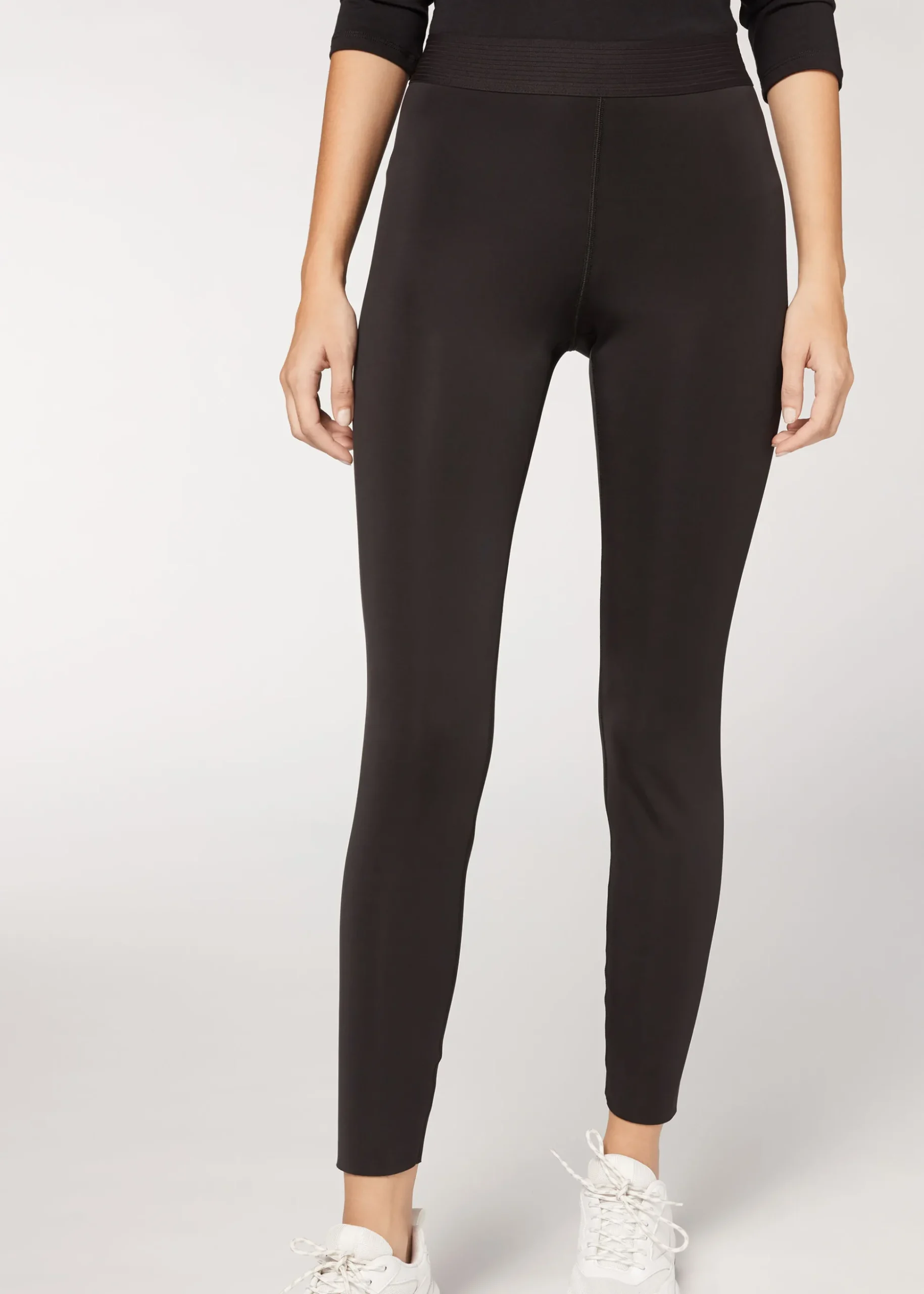 Leggings termico realizzato in un tessuto double face. Da un lato la texture appare liscia dall’aspetto uniforme, dall’altra risulta particolarmente morbida e lievemente pelosa: il tessuto double face permette di indossare l’articolo da entrambi i lati. Cinturino confortevole in vita.