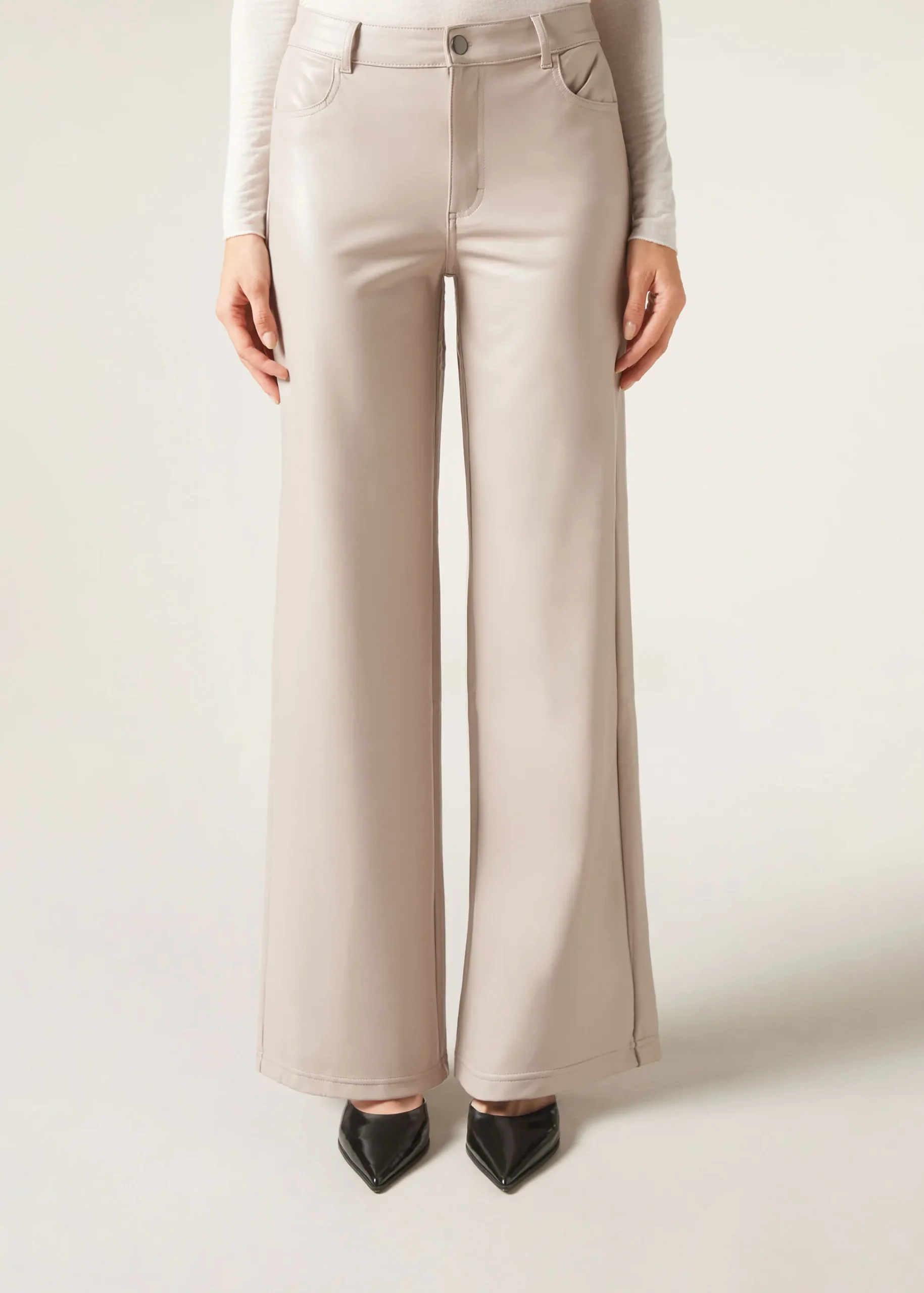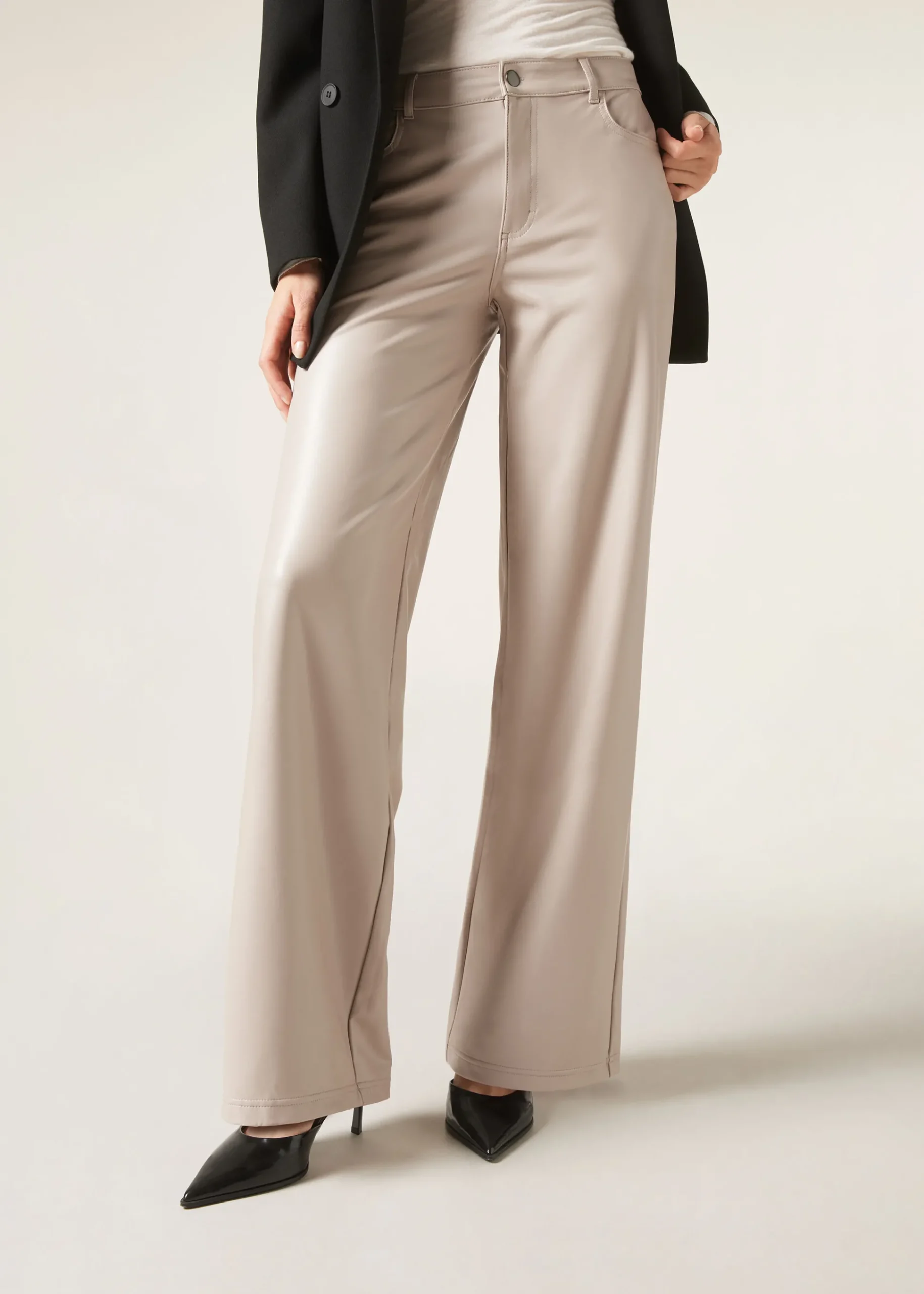 Pantaloni a palazzo da donna realizzati in tessuto effetto spalmato, un vero e proprio must have. Dotati zip e bottone, passanti in vita e pratiche tasche anteriori, combinano stile e funzionalità. Le pences posteriori sono una scelta intelligente per migliorare la vestibilità e garantire un look impeccabile.