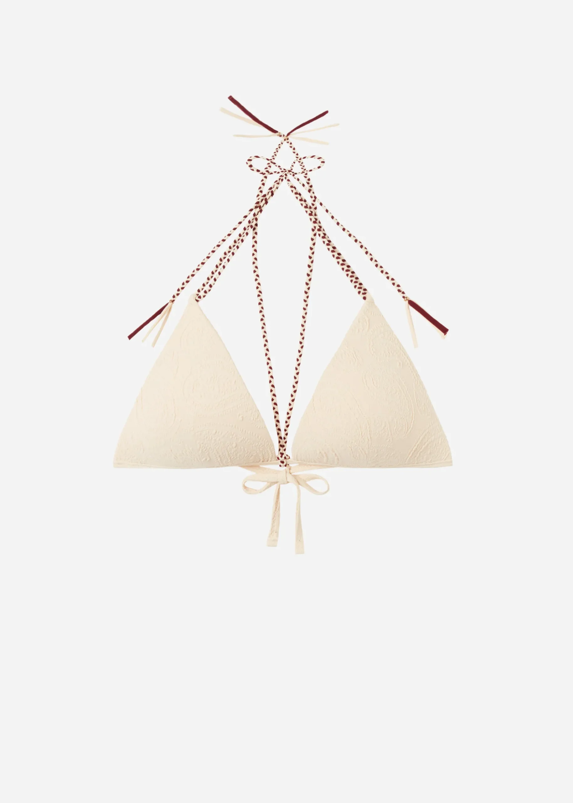 Top per bikini modello a triangolo fisso senza ferretto, con coppe imbottite graduate per un effetto volume che enfatizza il décolleté. Caratterizza lo stile un tessuto tridimensionale con disegno cashmere particolarmente morbido. Il lungo laccio sfilabile sul décolleté che si allaccia dietro la nuca e le spalline sono caratterizzati da una treccia bicolor. Chiusura posteriore con laccio sottile.